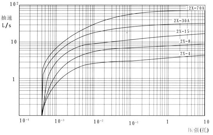 (2)抽氣速率是根據幾何尺寸算出的在大氣壓強j時,實際抽速與幾何抽速基本相符合,在各種不同的壓強時,抽速有一定下降,抽速與壓力關系見下圖2X旋片式真空泵的性能曲線圖。