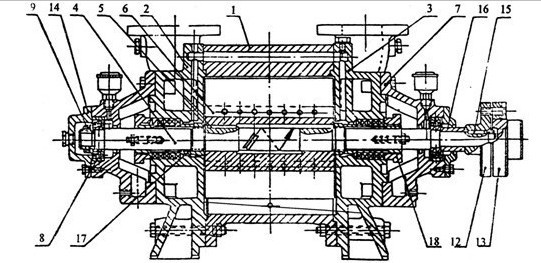 裝配時最主要的是調(diào)整葉輪端面和側(cè)蓋的間隙,在兩邊總的間隙對開SZ-3及SZ-4不得超過0.4毫米,對SZ-1及Z-2不得超過0.3毫米。間隙由泵體(1)和側(cè)蓋(2)之間加墊取得,葉輪兩端間隙應(yīng)該均稀,可擰軸套螺母(17)以移動葉輪來保證.